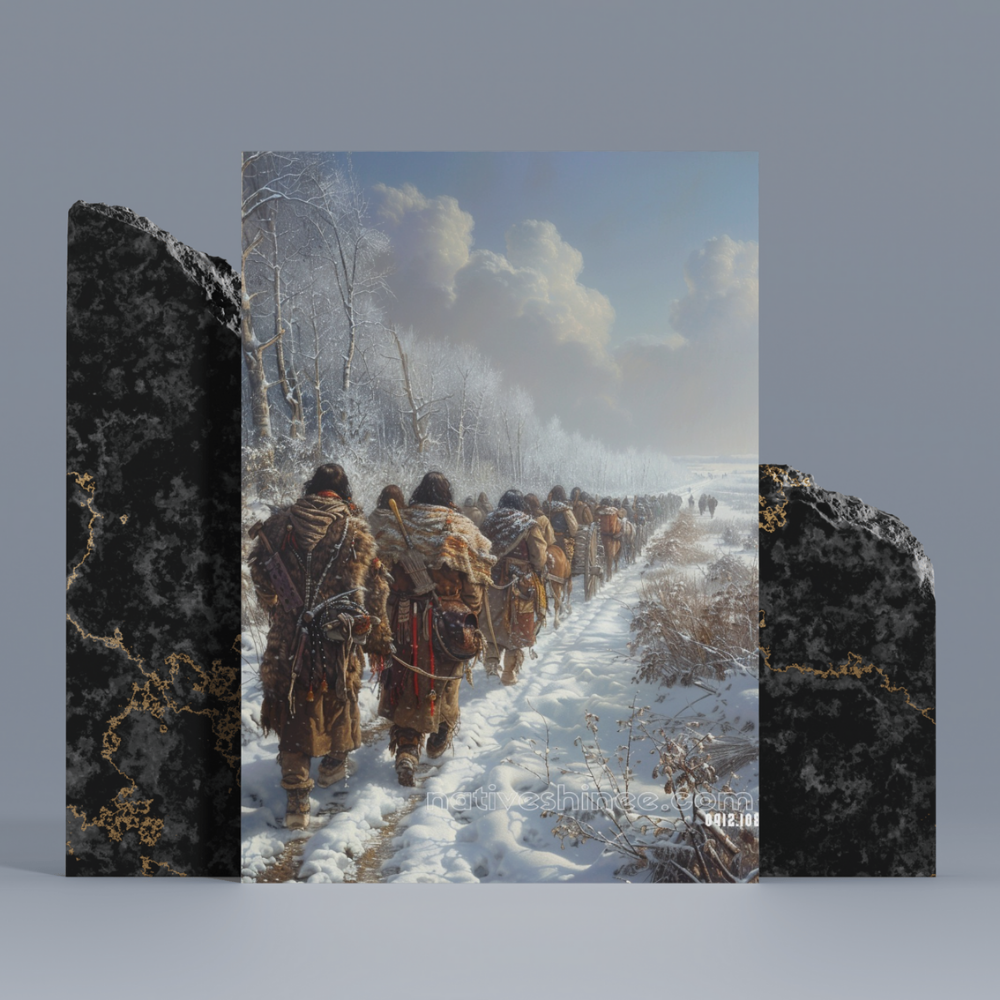 In Enduring the Winter Path, a determined procession moves through pristine snow, their fur-lined garments reflecting unity and resilience against the biting cold in this Native American Canvas