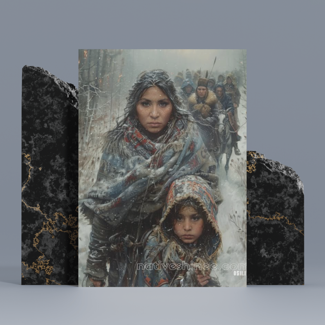 A mother and her child brave the harsh, snow-laden wilderness, their determined expressions reflecting strength and resilience. Wrapped in vibrant, traditional shawls, they lead a procession of riders, each figure embodying the spirit of survival and unity amidst the unforgiving cold. The burning embers of trees in the background speak to the challenges faced, while their presence stands as a testament to the enduring bond of family and community. A poignant reminder of heritage and perseverance, beautifully encapsulated in Enduring the Winter's Trial Native American Canvas.