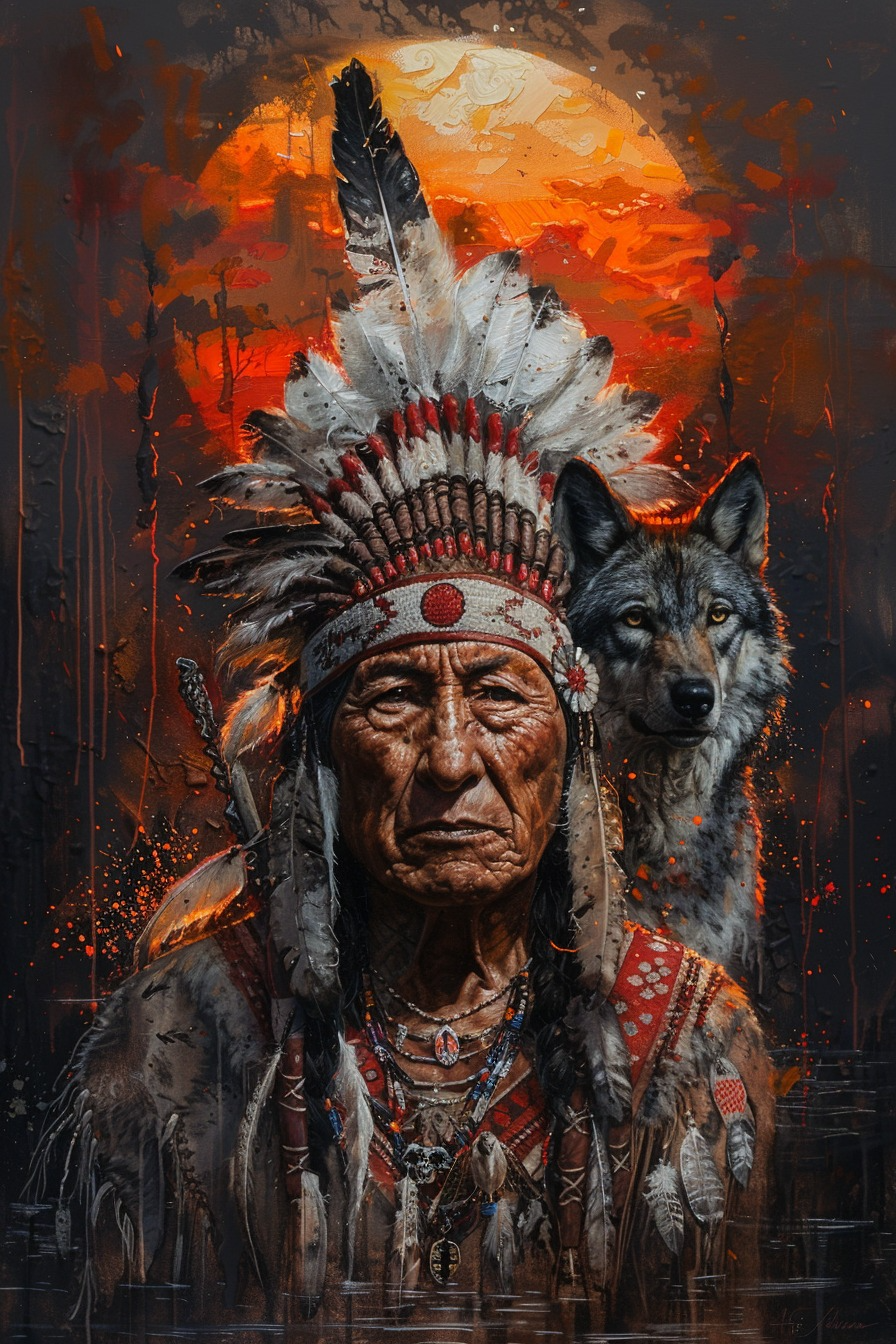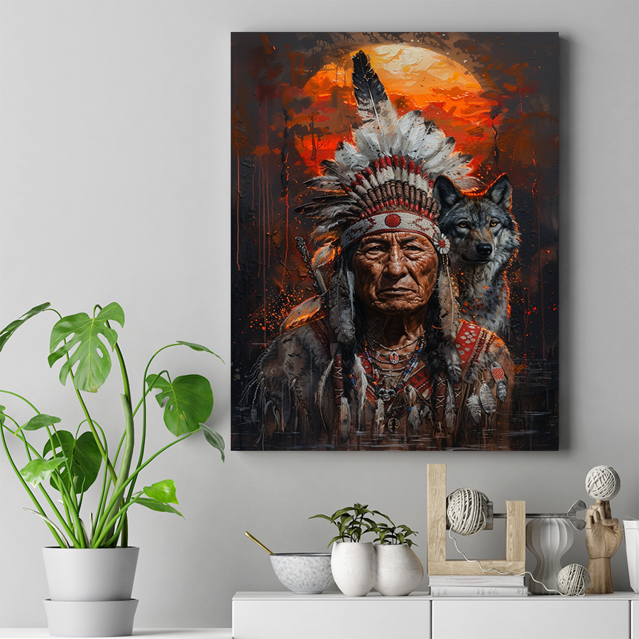 The "Eternal Strength: Elder and Wolf Native American Canvas" beautifully portrays the powerful connection between an elder and a wolf, symbolizing wisdom, resilience, and the spirit of guidance within Native American culture. This artwork features an elder standing alongside the noble wolf, both figures embodying strength and harmony with nature. Rich, earthy tones and fine details bring this meaningful bond to life, celebrating the legacy and endurance passed down through generations. Ideal for those who appreciate Native American heritage and the symbolism of wisdom, this high-quality canvas adds depth, inspiration, and cultural significance to any home or office décor.