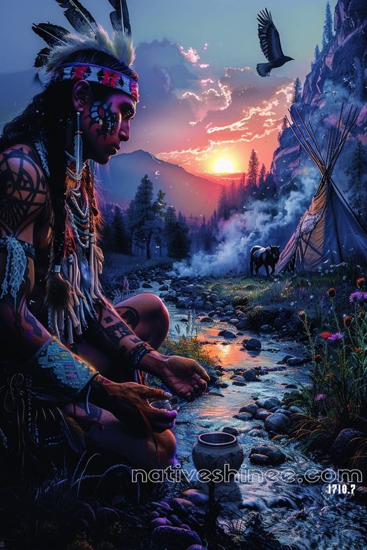 This mesmerizing canvas captures a quiet, reflective moment at dusk as a Native American man sits by a flowing creek, enveloped by the natural beauty around him. Painted with intricate details, his ceremonial attire speaks of heritage and connection to the earth. The sunset bathes the scene in vibrant hues, illuminating his face as he holds an offering, symbolizing peace and harmony with nature. In the background, a teepee, a bison, and an eagle soaring high reflect a life interwoven with the wilderness. This artwork invites viewers into a world of deep spirituality and reverence for the land, making it a breathtaking addition for any space that honors Indigenous traditions and the spirit of the earth.
