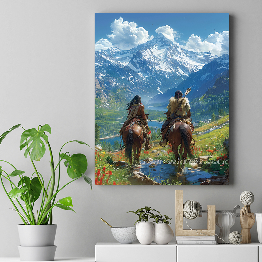 The "Exploring the Great Mountain Wilderness Native American Canvas" vividly captures the spirit of adventure and reverence for nature’s grandeur. This artwork features a Native American figure journeying through towering mountain landscapes, embodying a harmonious connection with the land. With rich, natural tones and intricate details, this canvas celebrates the awe and beauty of the wild, honoring a deep-rooted respect for the natural world. Perfect for those who admire cultural heritage and majestic landscapes, this high-quality canvas brings inspiration, tranquility, and a touch of the wilderness into any home or office décor.