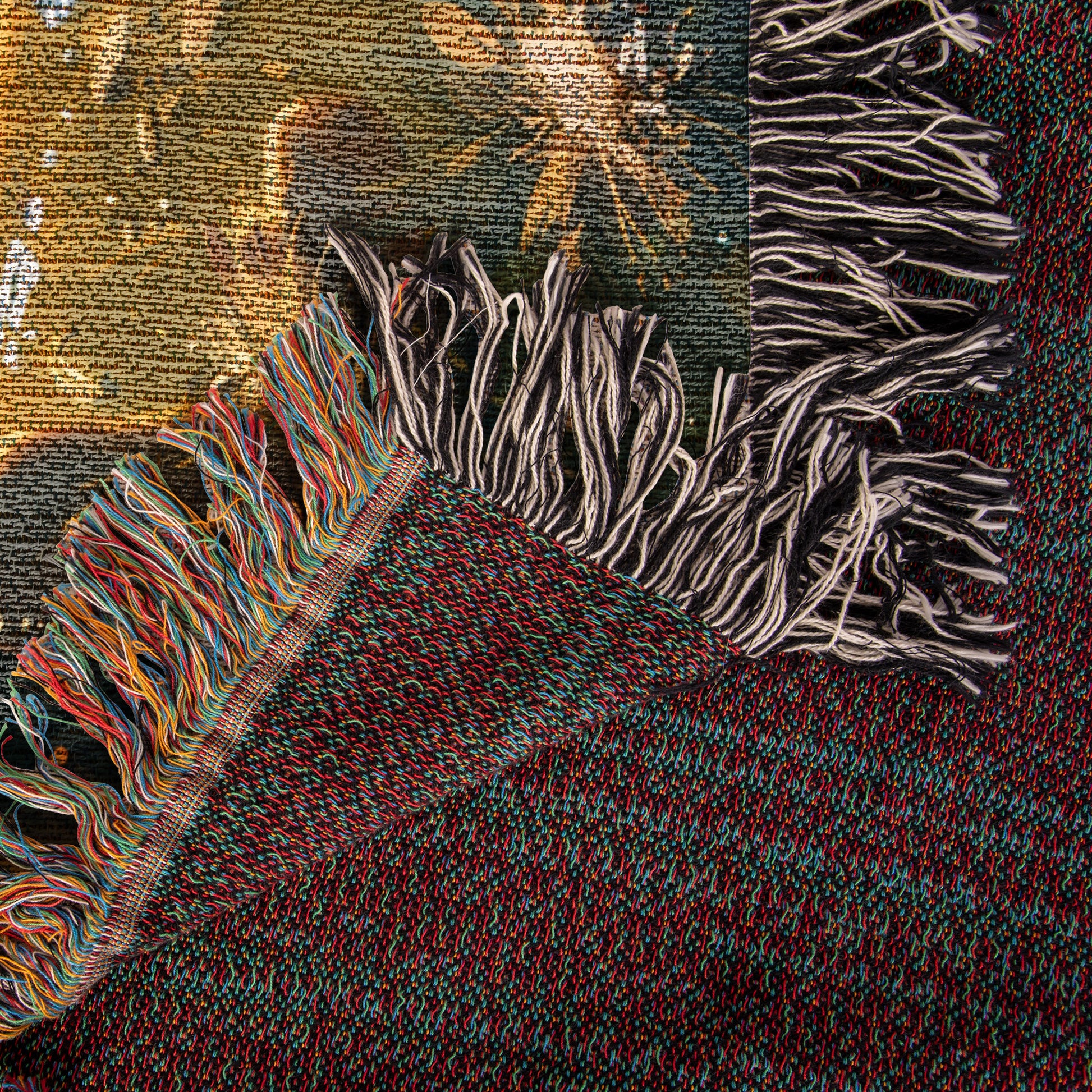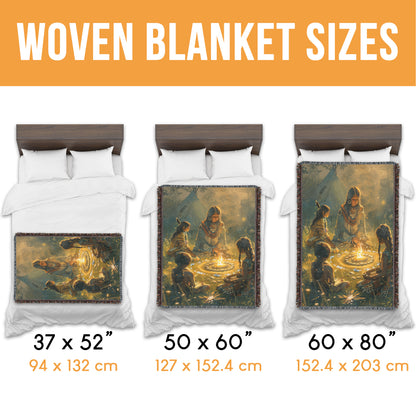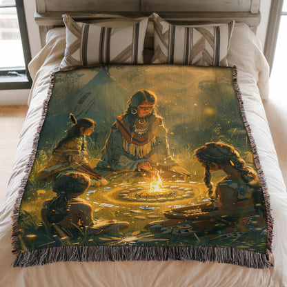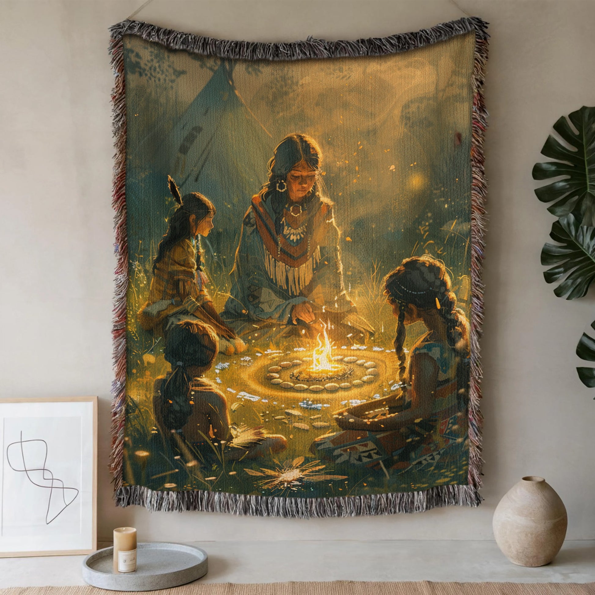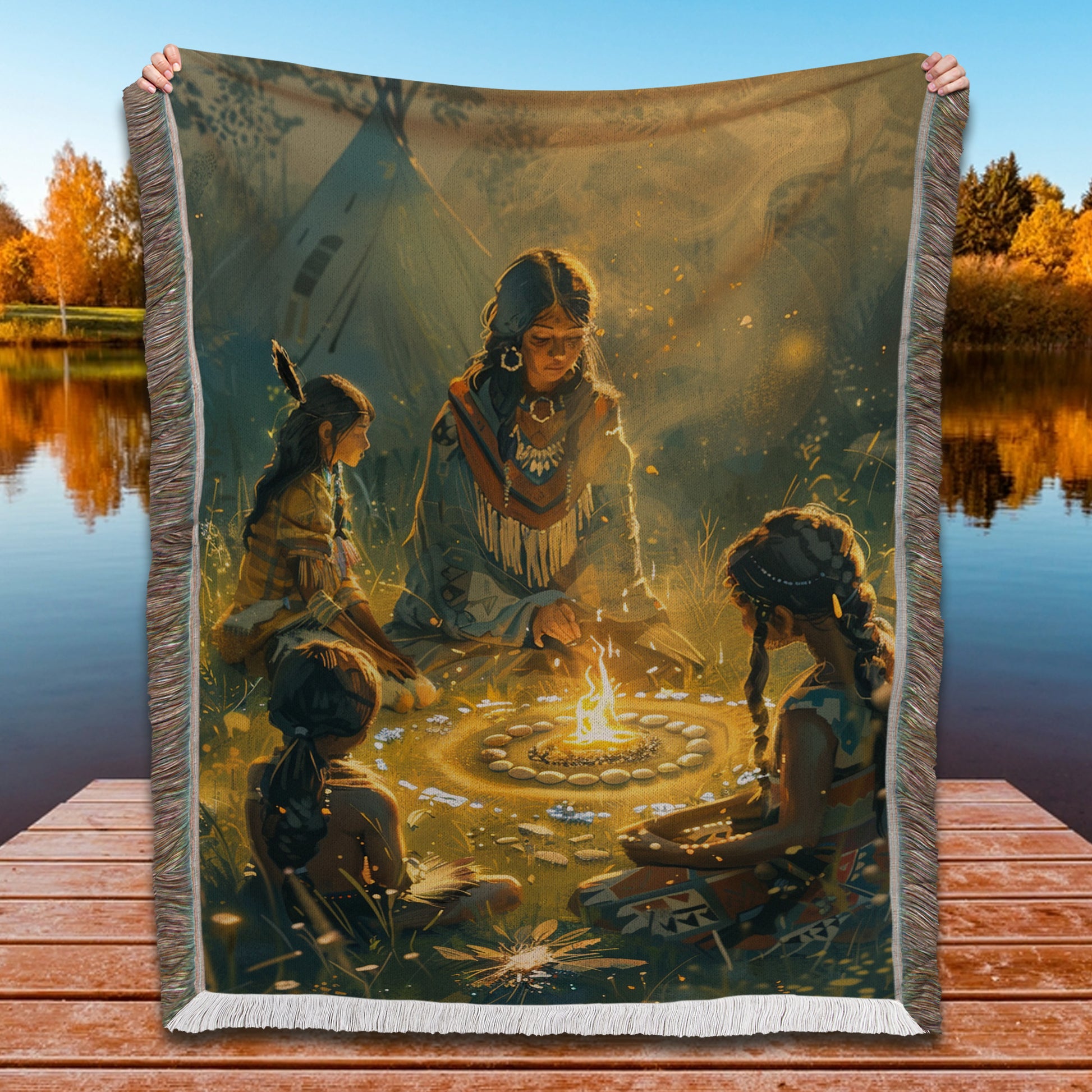 Gather around the warmth of tradition with our Fire Circle Harmony Woven Blanket! This captivating throw features a Native American mother in traditional attire, sitting with her children around a glowing fire circle in a meadow, with a teepee in the background and a sunset sky casting a warm glow. Perfect for those who cherish cultural heritage and the sacred bonds of family, this blanket adds a touch of serene beauty to any space. Crafted from 100% cotton and expertly woven for a soft, breathable, and durable finish, it’s ideal for cozying up on chilly evenings, draping over your couch, or displaying as a striking wall tapestry. The fringed edges enhance its rustic charm, making it a versatile piece for both decor and comfort. Wrap yourself in the heartfelt imagery of this Native fire circle scene, and let its warmth inspire your cozy moments.