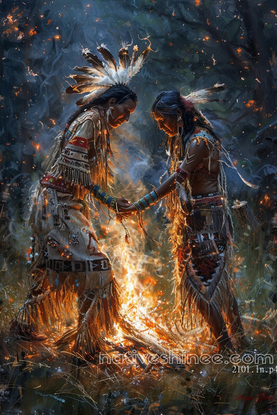A captivating portrayal of two Native American warriors performing a ritual dance around a sacred fire, symbolizing the deep connection between the spiritual and physical realms. Their detailed attire, adorned with feathers, beads, and fringes, tells a story of tradition and strength. The swirling flames illuminate the warriors' movements, creating an ethereal glow that reflects the rich cultural heritage. This striking image captures the essence of Native American spirituality and unity, making it a powerful statement piece for any home. Native American Canvas.