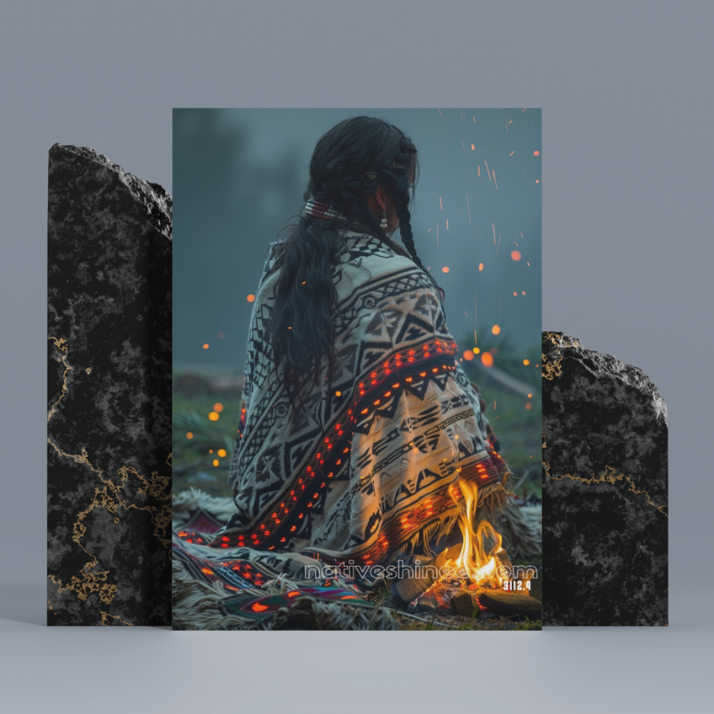 This captivating canvas portrays a Native American woman sitting quietly by a glowing fire, her back adorned with a patterned, traditional blanket. The intricate designs of her shawl contrast beautifully with the warm flicker of embers that dance through the cool, misty twilight. Her braided hair and serene posture evoke a sense of calm introspection and connection to the surrounding wilderness. This image symbolizes the enduring traditions and intimate moments of solitude, reflecting a timeless bond between culture and nature.