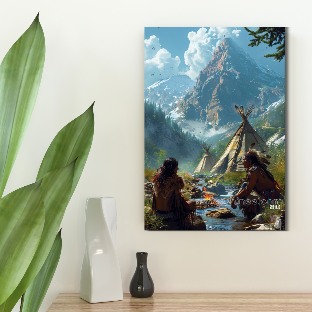 A powerful and tender moment between a Native American couple, their hands immersed in sacred water, symbolizing life, harmony, and connection. Surrounded by the vibrant colors of nature and the serene presence of their community's tipi dwellings, this image radiates love, spirituality, and cultural heritage. The intricate beadwork and feather adornments highlight the profound respect for their traditions, captured on this Native American Canvas.