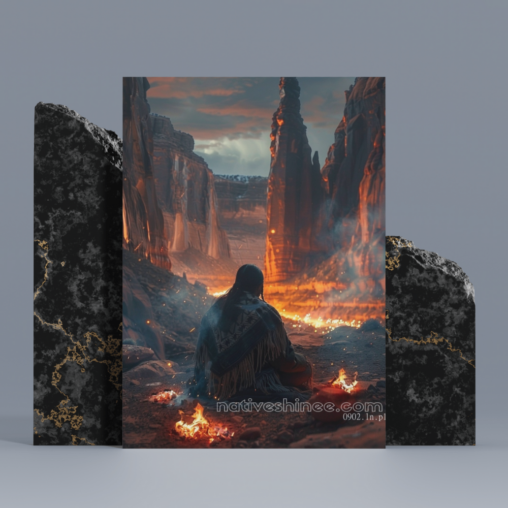 This striking Native American canvas captures a powerful moment of reflection and ritual in a fiery, awe-inspiring landscape. A solitary figure, wrapped in a traditional woven blanket, sits in stillness amidst the flames and towering rock formations. The surrounding embers glow against the backdrop of a vivid sunset sky, creating a scene of profound spiritual connection and resilience. This piece embodies the strength and depth of Native American culture, offering a striking visual representation of the sacred bond between the earth, fire, and spirit. Perfect for those looking to celebrate tradition and the power of nature