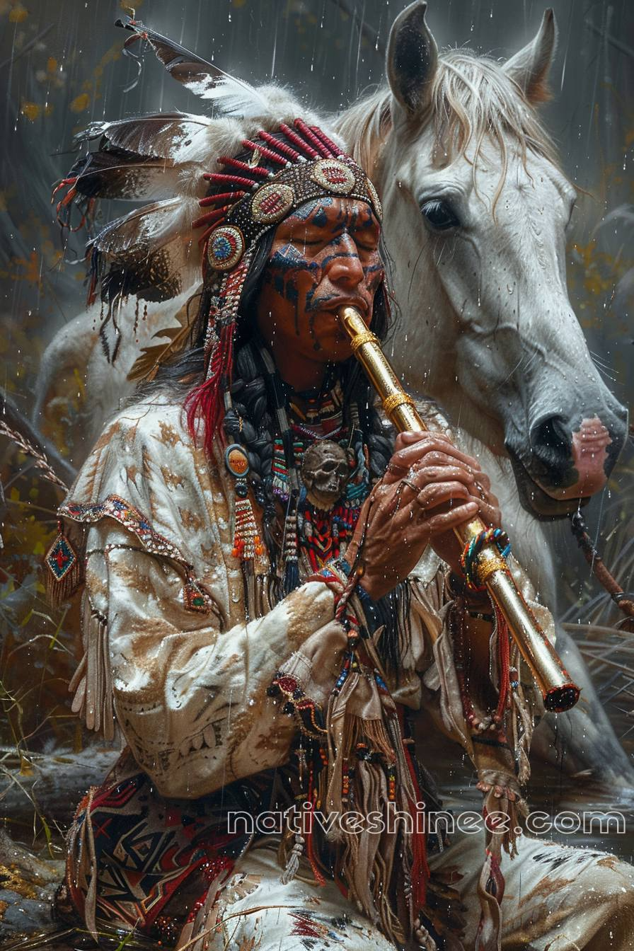 The "Flute Melody in the Rain Native American Horse Canvas" captures a serene and mystical moment as a Native American figure plays the flute amidst gentle rainfall, accompanied by a loyal horse. This artwork embodies harmony with nature, where the soft melody of the flute and the soothing rain create a scene of peace and reflection. With delicate tones and detailed artistry, the canvas reflects a deep connection to tradition, nature, and companionship. Perfect for those who appreciate cultural heritage and tranquil beauty, this high-quality canvas brings calm, inspiration, and a sense of timelessness to any home or office décor.