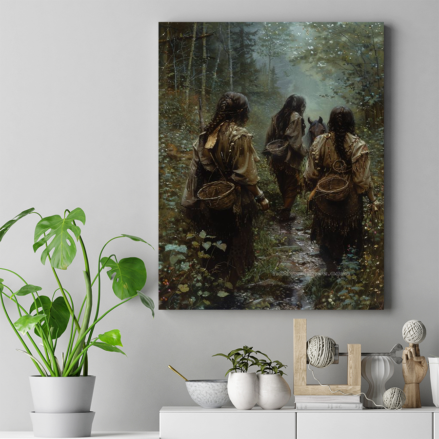 The "Forest Trails and Heritage Native American Canvas" beautifully captures a journey through wooded paths rich with cultural significance and ancestral spirit. This artwork showcases a Native American figure walking along a serene forest trail, symbolizing a connection to both nature and heritage. With earthy greens and browns, the canvas evokes the harmony and reverence for the land that is central to Native traditions. Perfect for those who value cultural roots and natural beauty, this high-quality canvas brings depth, tranquility, and inspiration to any home or office décor.