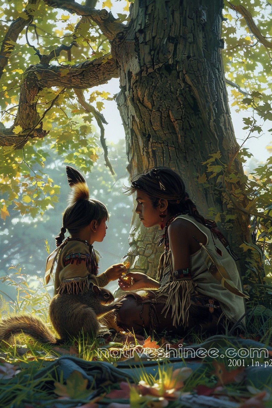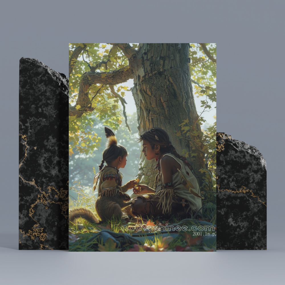 Embrace the serene beauty of the Forest Wisdom Native American Canvas featuring a tender moment between two Native American children under a majestic tree, surrounded by vibrant autumn leaves. With detailed traditional attire and a curious squirrel nearby, this artwork captures the essence of innocence, nature, and cultural heritage. A perfect addition to any space for a touch of warmth and meaning.
