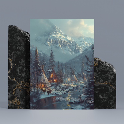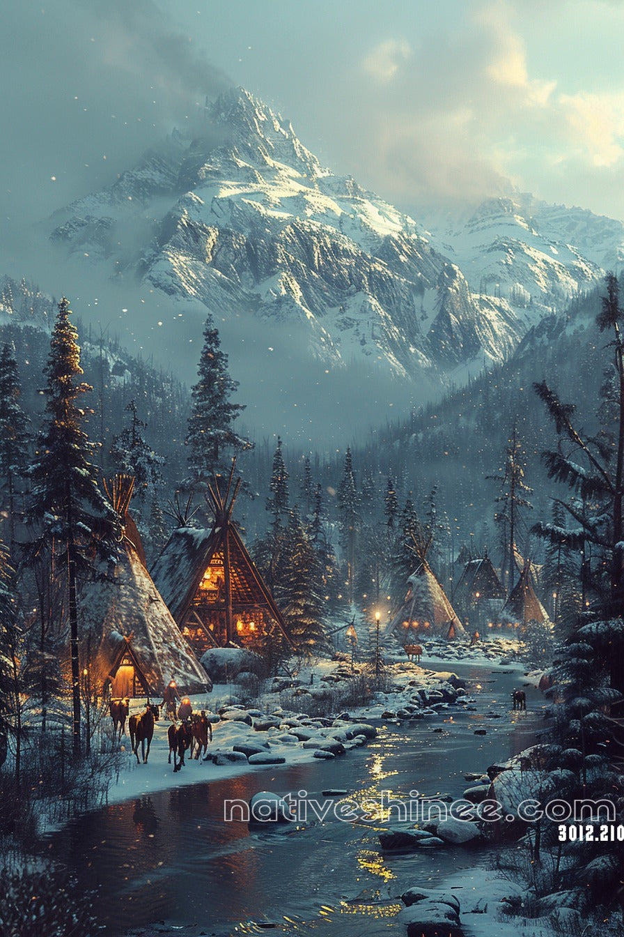 n the hush of a snowy twilight, a tranquil encampment nestles beneath towering, ice-capped peaks. Warm light spills from cozy tipis, reflecting on the frosted riverbank and casting a comforting glow that stands against the crisp mountain air