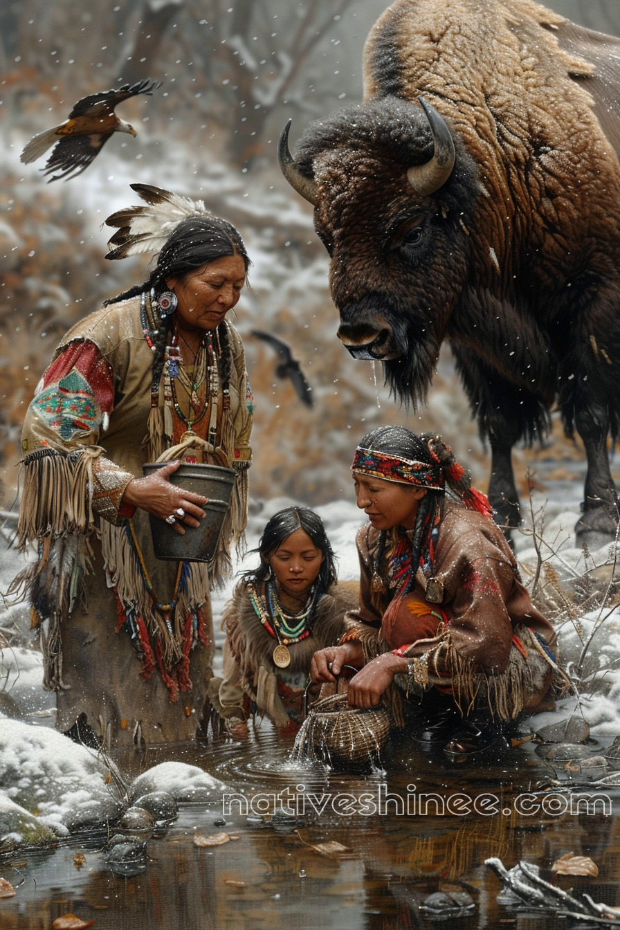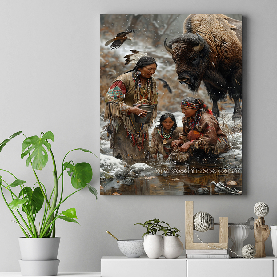 The "Gathering at the Bison's Stream Native American Canvas" depicts a serene scene where Native Americans gather by a tranquil stream, surrounded by the majestic presence of bison. This artwork celebrates the connection between the people and the land, highlighting the importance of nature in their cultural practices. With earthy tones and detailed artistry, the canvas captures a moment of unity, reflection, and reverence for the bison, a symbol of strength and sustenance. Ideal for those who cherish cultural heritage and the beauty of wildlife, this high-quality canvas adds warmth, inspiration, and a touch of nature to any home or office décor.