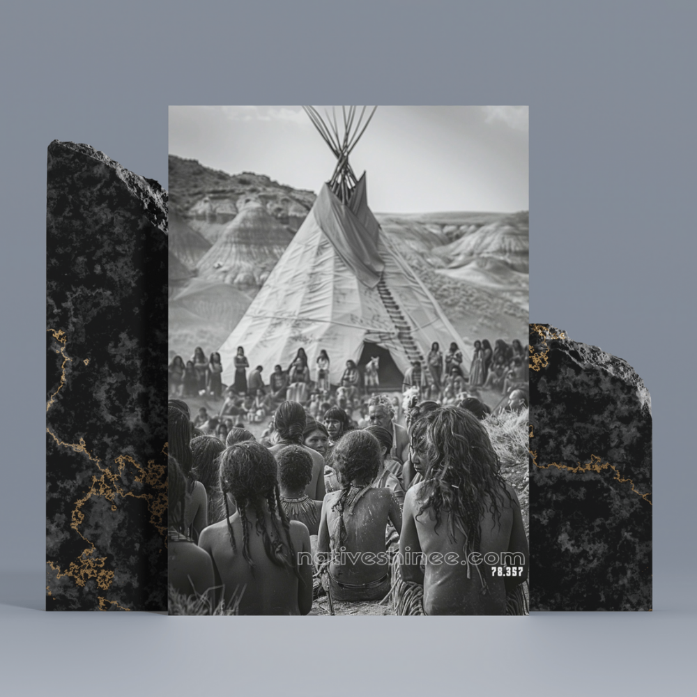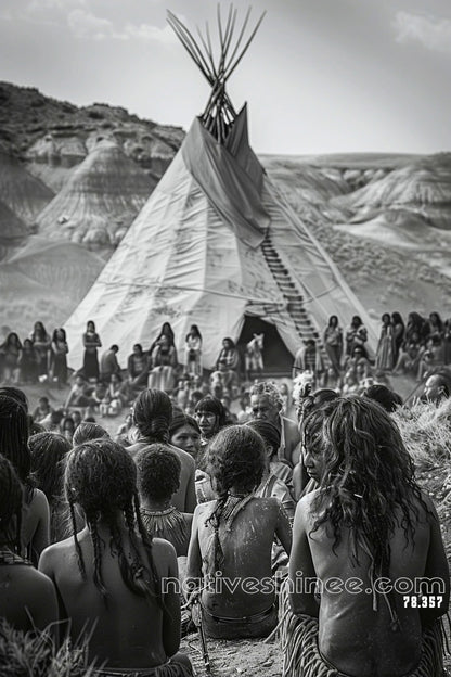 A timeless black-and-white portrayal capturing a sacred gathering of Native American people under the vast, rugged landscape of the Badlands. The focus draws to a large tipi, standing tall and steadfast, surrounded by a sea of faces reflecting connection, wisdom, and community. The atmosphere exudes a sense of reverence and unity, encapsulating the stories, traditions, and shared spirit of a resilient culture.