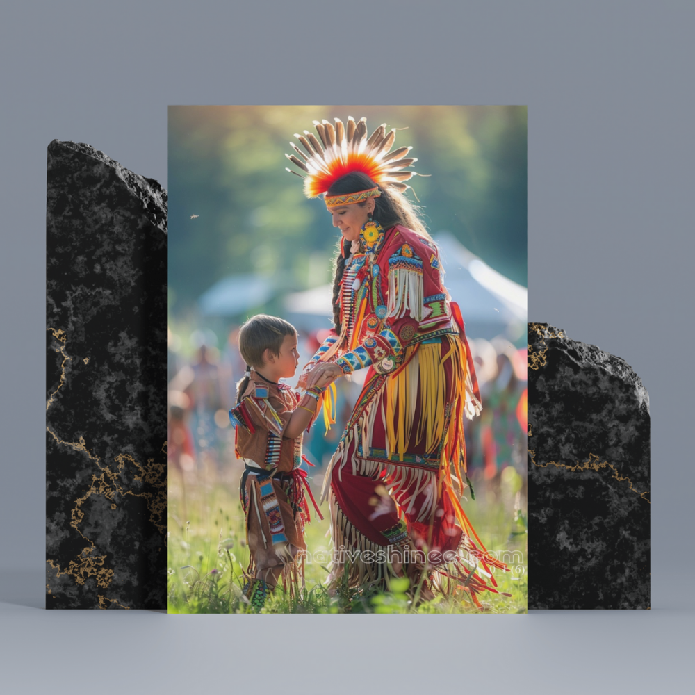 In this beautifully captured moment, a mother and her child dance together, embodying the joy and connection that transcend generations. The vibrant colors of their traditional attire, rich in beads and feathers, catch the sunlight as they sway in harmony with the rhythm of their people. The child, with innocent wonder in his eyes, holds the hand of his mother, who guides him with love and pride. The background is filled with the energy of a festival, yet their shared moment of dance remains intimate and timeless. This artwork celebrates the bond between mother and child, the strength of cultural traditions, and the passing down of heritage. It is a portrait of love, connection, and continuity.