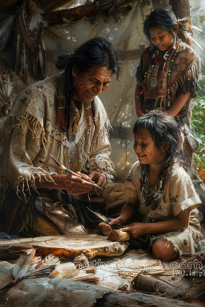 Embrace the warmth and wisdom of Native American heritage with this striking artwork, depicting a cherished moment between a wise elder and children. Together, they craft with love and tradition, passing down knowledge that has endured through generations. The intricate beadwork, the focused expressions, and the shared joy in their work reflect the deep connection to culture, family, and the land. Printed on high-quality, durable canvas, this piece brings life and meaning to any room, making it a perfect gift or addition to your home décor. Celebrate the spirit of community and tradition with this Native American Canvas – order now.