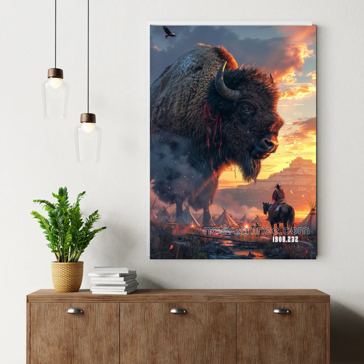 Spirit of the Plains – Guardian of the Buffalo Nation is a breathtaking portrayal of strength, reverence, and the sacred bond between humanity and nature. At the heart of the composition stands a colossal buffalo, its presence both majestic and otherworldly, symbolizing endurance, abundance, and the spirit of the Great Plains. Beneath a sky ablaze with the hues of dawn, a lone rider gazes upon the mighty creature, his posture humble yet resolute — a tribute to the ancestral connection between warrior and guardian spirit. Smoke and fire rise from the earth, blending into the golden light of sunrise, representing both destruction and renewal. The buffalo’s eyes hold a timeless wisdom, a reminder of balance between taking and giving, survival and respect. Every detail — from the wind-tossed mane to the faint silhouettes of distant tipis — evokes the deep spiritual harmony once shared by the people and the land. This canvas is a visual prayer for protection, gratitude, and eternal unity with nature.