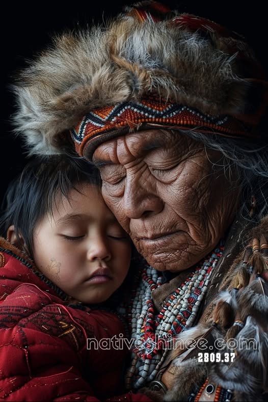 Generations of the Heart captures an intimate and deeply emotional moment between an elder and a child, two souls bound by love, legacy, and the eternal rhythm of life. The elder’s weathered face tells stories of time, endurance, and wisdom — each wrinkle a testament to a lifetime of strength and survival. The child, resting peacefully in their arms, symbolizes the continuity of that strength, the gentle promise of tomorrow. Wrapped in traditional garments of fur and beadwork, their shared embrace transcends words, embodying the sacred bond between generations in Native culture — where knowledge, courage, and spirit are passed through touch and silence rather than speech. This piece radiates warmth and reverence, reminding us that heritage is not taught, but felt — carried in the heartbeat of family and the wisdom of ancestors.