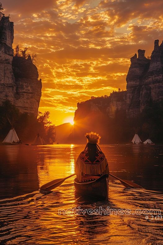 A lone paddler, wrapped in intricate native attire, glides gracefully through a golden river as the sun sets between towering canyon walls. The water shimmers like liquid fire, mirroring the rich amber hues of the sky. Teepees dot the shoreline, their presence adding to the timeless serenity of this sacred landscape. This breathtaking moment encapsulates the harmony of human spirit and natural splendor, a tranquil journey through a realm where history and nature unite.