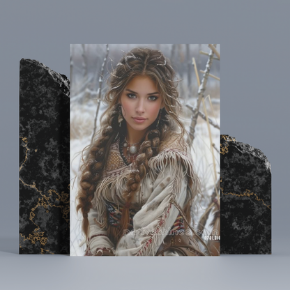 Grace of the Winter Winds showcases the serene beauty and strength of a Native American woman in the midst of winter’s embrace. The soft snowfall surrounds her, as her intricate braids and traditional attire reflect the deep connection between nature and her heritage. The detailed beaded accessories and the subtle elegance of her gaze evoke a sense of wisdom and resilience, while the frosty landscape behind her symbolizes endurance. Perfect for those who appreciate the balance of femininity and strength in Native American culture, this stunning canvas captures the essence of winter, beauty, and tradition