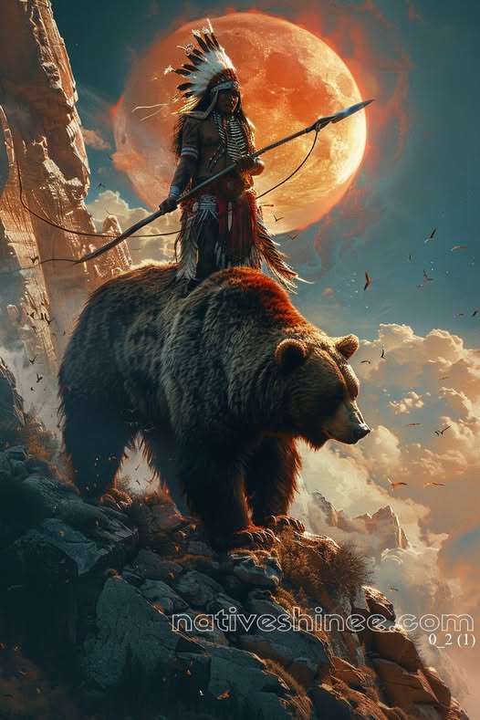 This stunning canvas showcases a Native American warrior standing proudly on a majestic bear, silhouetted against the fiery glow of a full crimson moon. The warrior, adorned in traditional regalia with an intricate headdress and holding a spear, embodies strength, courage, and unity with nature. The rugged cliffs and dramatic sky filled with vibrant colors add an ethereal quality, symbolizing the sacred bond between humans and the spirit of the wild. A powerful depiction of leadership and resilience, this is the Guardian of the Crimson Moon Native American Canvas.