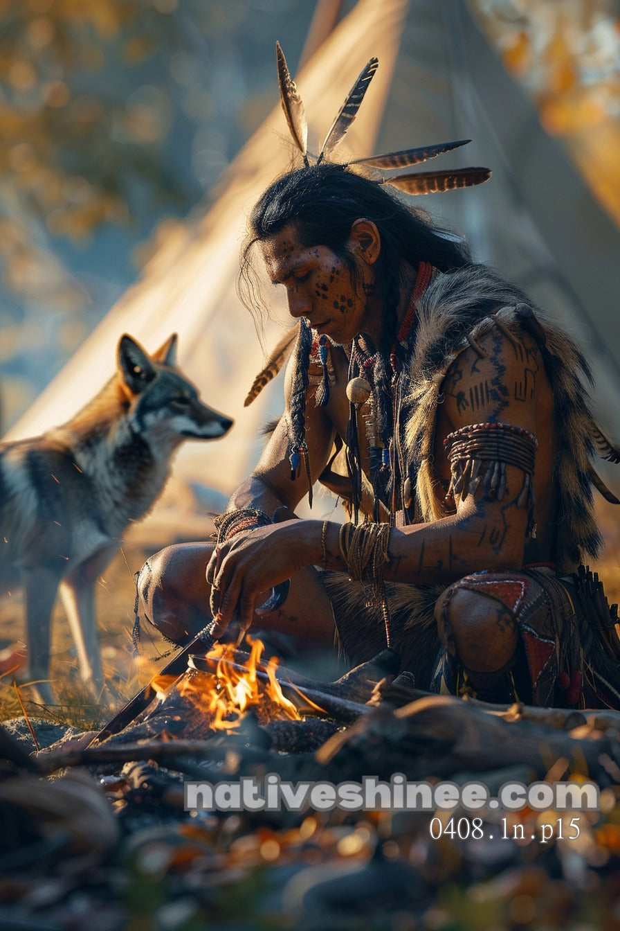 This canvas depicts a serene and powerful scene of a Native American figure adorned with traditional feathers and intricate tattoos, sitting by a crackling campfire. A loyal wolf stands nearby, gazing attentively, symbolizing a deep connection with nature and spirituality. The warm glow of the fire illuminates the tipi in the background, blending earthy tones with the soft hues of a twilight sky. Framed elegantly, the artwork is complemented by a minimalist room setting with a wooden cabinet, a potted plant, and hanging lights, enhancing its cultural and aesthetic appeal.