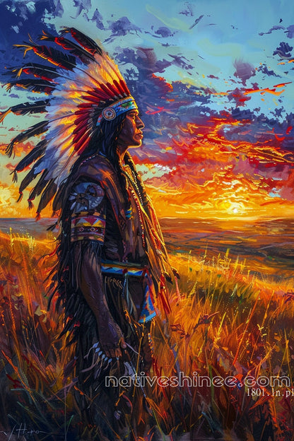 In Guardian of the Flaming Sky, a proud figure stands against a radiant sunset, embodying the enduring spirit and vibrant cultural legacy of the plains. Warm hues of gold and crimson fuse the earth and sky in this Native American Canvas
