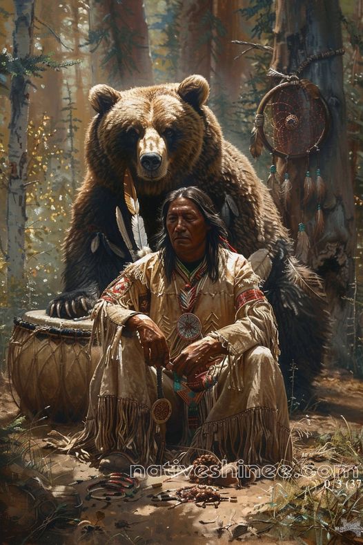 This captivating scene depicts a Native American elder seated in quiet reflection, surrounded by the embrace of the forest. Clad in ceremonial regalia, the elder exudes wisdom and connection to the earth, while a powerful grizzly bear stands protectively behind, symbolizing strength and spiritual guidance. The dreamcatcher, swaying gently in the background, adds a touch of mystical energy to the atmosphere. Illuminated by the soft interplay of sunlight filtering through the trees, the scene portrays the harmony between man, nature, and the sacred. A testament to resilience, tradition, and the bond with the wild.
