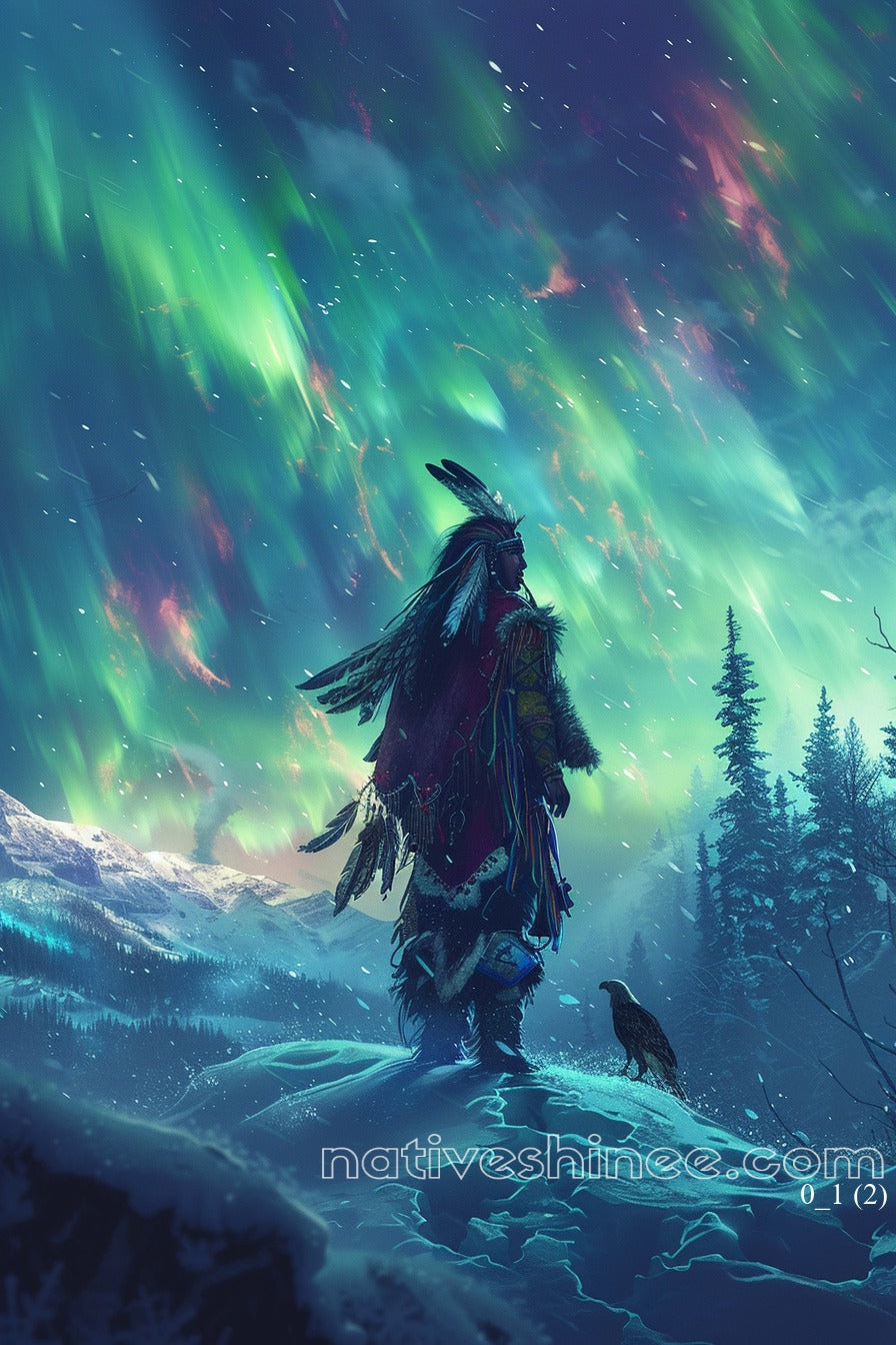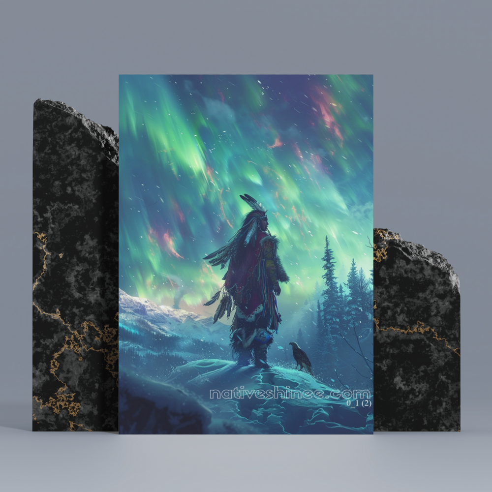 "Guardian of the Northern Lights" captures an awe-inspiring moment as a proud Native figure, draped in vibrant ceremonial regalia, stands beneath the enchanting hues of the Aurora Borealis. The backdrop of snow-draped mountains and towering evergreens enhances the mystical atmosphere, while the figure's poised stance symbolizes strength and harmony with the natural world. The interplay of light and color in the sky adds a celestial touch, making this artwork a perfect representation of resilience, culture, and the beauty of the Arctic wilderness. A striking addition for those who cherish artistry that bridges nature and spirituality.