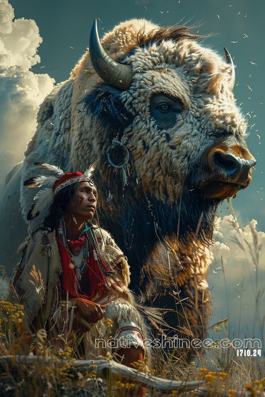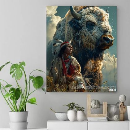 This powerful artwork showcases a Native American figure sitting amidst golden prairie grasses, cloaked in traditional attire that speaks of ancestral wisdom. Towering above is the majestic white buffalo, a sacred symbol of abundance and spiritual significance. The buffalo's presence dominates the sky, merging strength with serenity, as swirling clouds frame this profound connection. The gentle interplay of light and shadow highlights the deep bond between humanity and the natural world, evoking reverence for the land and its sacred inhabitants. A timeless scene of harmony, respect, and spiritual unity.
