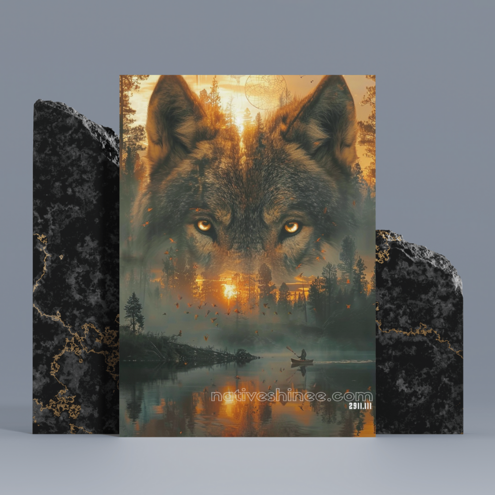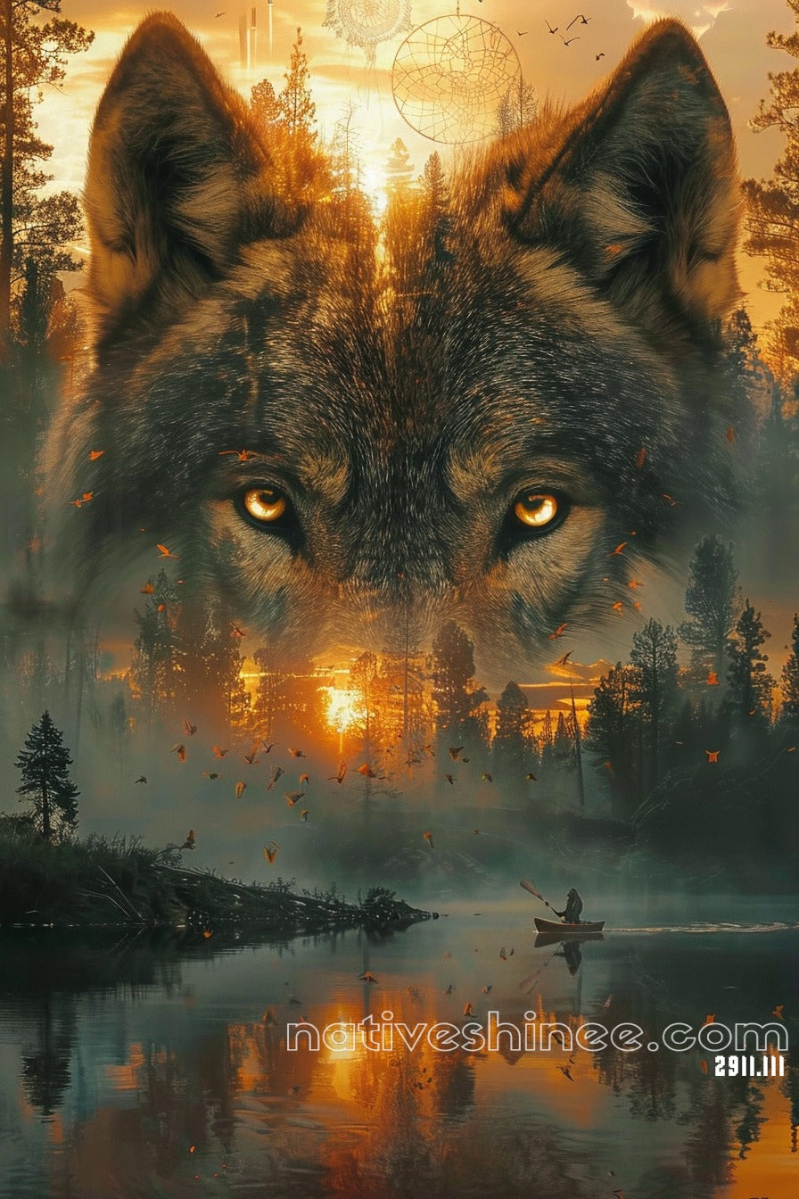 This powerful canvas captures the essence of the wild, where the mighty wolf watches over the land. The ethereal, glowing eyes of the wolf are intricately woven into the backdrop of a stunning sunset, where the light reflects off the peaceful river. The misty landscape, fluttering butterflies, and the peaceful figure gliding through the water in a canoe evoke a sense of harmony and connection with nature. The dreamcatcher, floating in the air, adds a layer of mysticism, guiding the soul toward balance and strength.