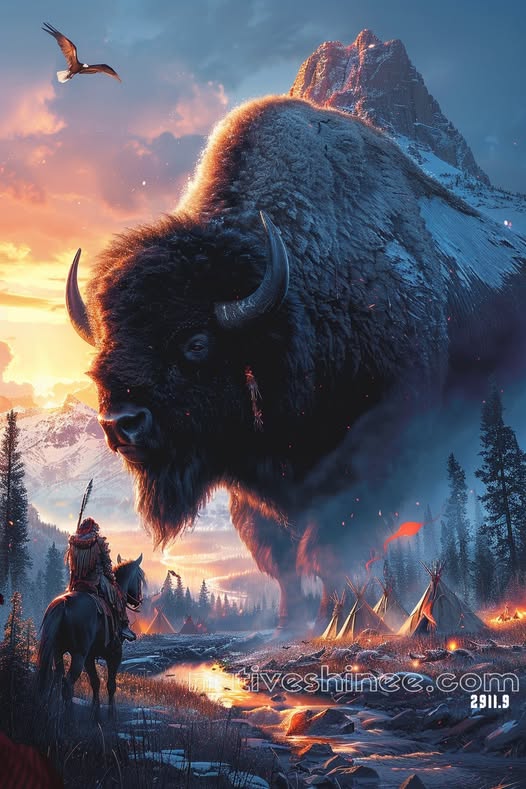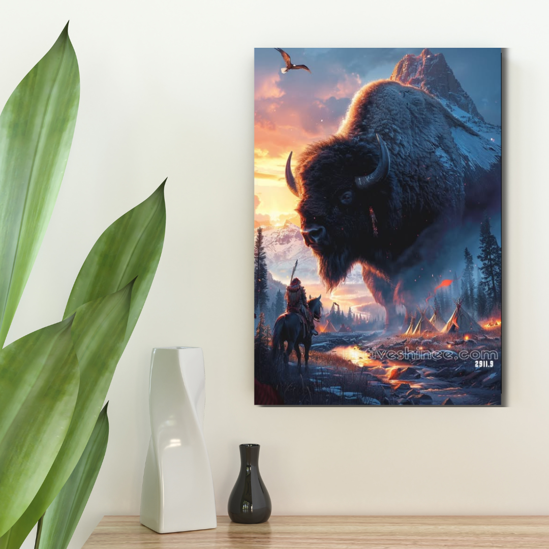 An awe-inspiring scene featuring a colossal buffalo towering over a tranquil Native American camp nestled in a valley of snow-capped mountains. The glowing embers of fires and the silhouette of a lone rider gazing at the towering creature evoke a profound sense of reverence and mysticism. The majestic sunrise casts golden light across the landscape, symbolizing the sacred bond between the people, the land, and its powerful spirits. A mesmerizing Native American Canvas.