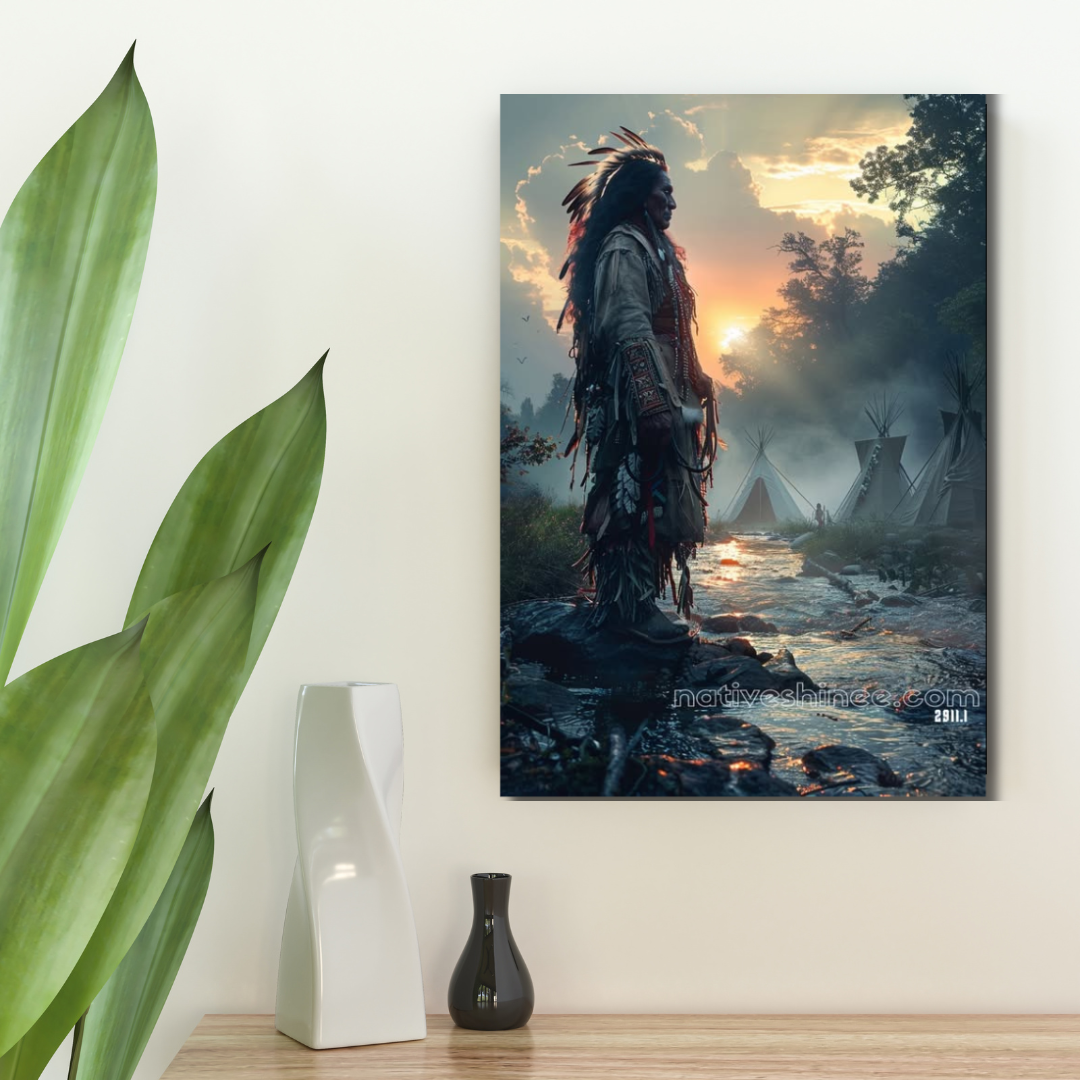 This stunning image depicts a proud Native American leader standing along a glistening stream as the first light of dawn breaks through the trees. The figure’s traditional regalia, adorned with intricate beadwork and feathered headdress, reflects the profound connection to culture and heritage. In the distance, a village of tipis rests peacefully under the morning mist, symbolizing community and harmony. Guardian of the Sunrise Native American Canvas captures a moment of reflection and strength, celebrating leadership and the timeless bond with nature.