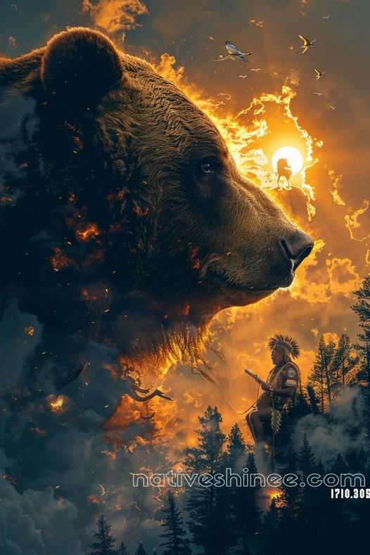 This striking canvas artwork merges the grandeur of a bear with the warmth of a radiant sunset, creating a powerful symbol of protection and strength in Native American culture. The bear’s silhouette looms large, illuminated by fiery clouds, as a warrior stands below, embodying resilience and reverence for the natural world. This piece celebrates the bear as a spiritual guardian, its presence harmonizing with the landscape and sky. A captivating addition for those drawn to the symbolism of animals and the beauty of Indigenous traditions, it invites reflection on the connection between humanity and the wild.