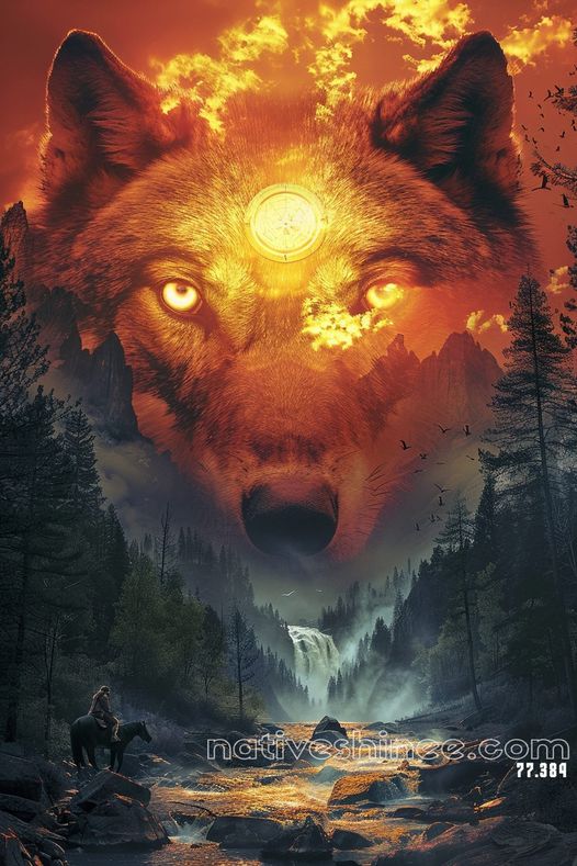 An awe-inspiring vision of a wolf’s fiery gaze fills the sky, its silhouette illuminated by the blazing hues of dawn. A dreamcatcher glows on its forehead, symbolizing protection and spiritual connection. Below, a lone rider on horseback pauses by a tranquil stream, surrounded by towering pine trees and cascading waterfalls in the distance. This mystical scene blends the untamed spirit of the wolf with the serene beauty of nature, evoking themes of guardianship, unity, and reverence for the natural world.