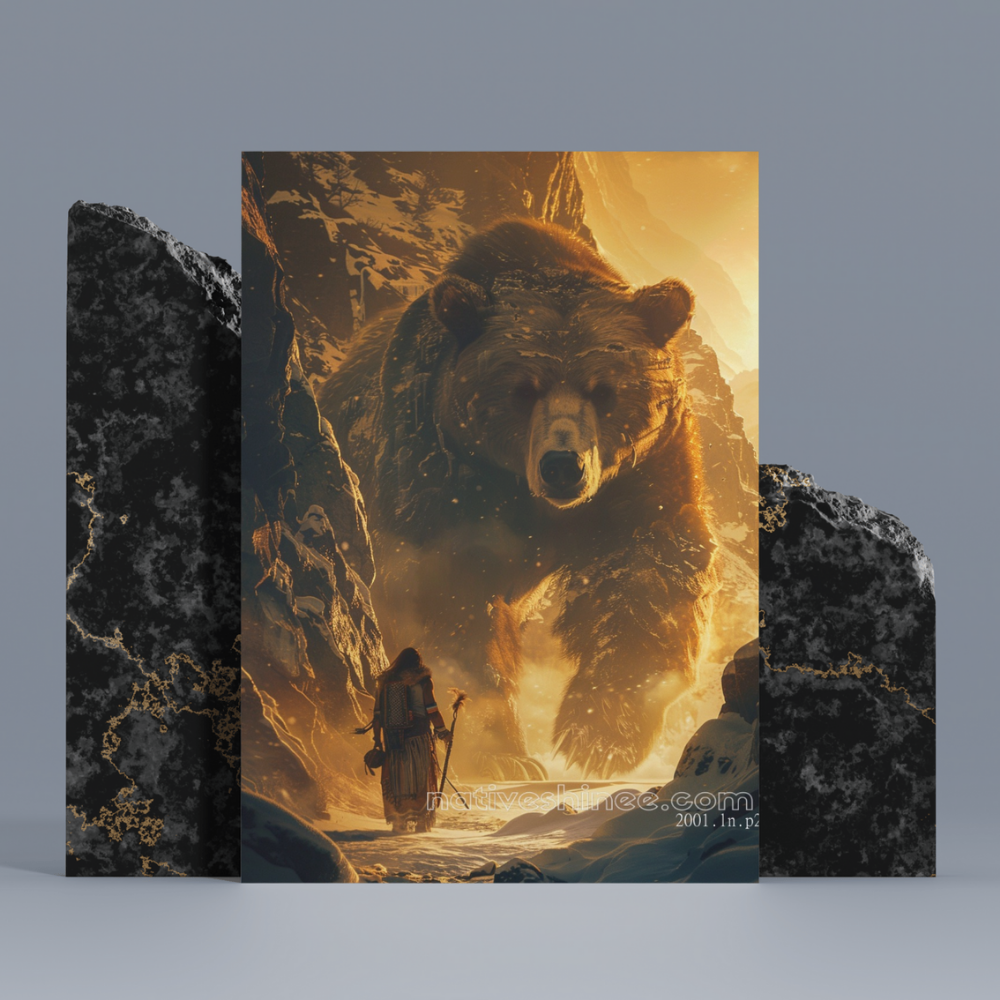 Experience the awe-inspiring bond between human and nature with the Guardian Spirit of the Canyon Native American Canvas. This breathtaking artwork depicts a powerful grizzly bear towering behind a Native American figure, both illuminated by the golden glow of a snowy canyon. The scene embodies resilience, courage, and the sacred connection between humanity and the natural world. Perfect for enhancing your living or office space, this canvas captures the raw beauty of wilderness and cultural heritage. A striking addition to any art collection or a thoughtful gift, it inspires admiration for nature's grandeur and timeless traditions.