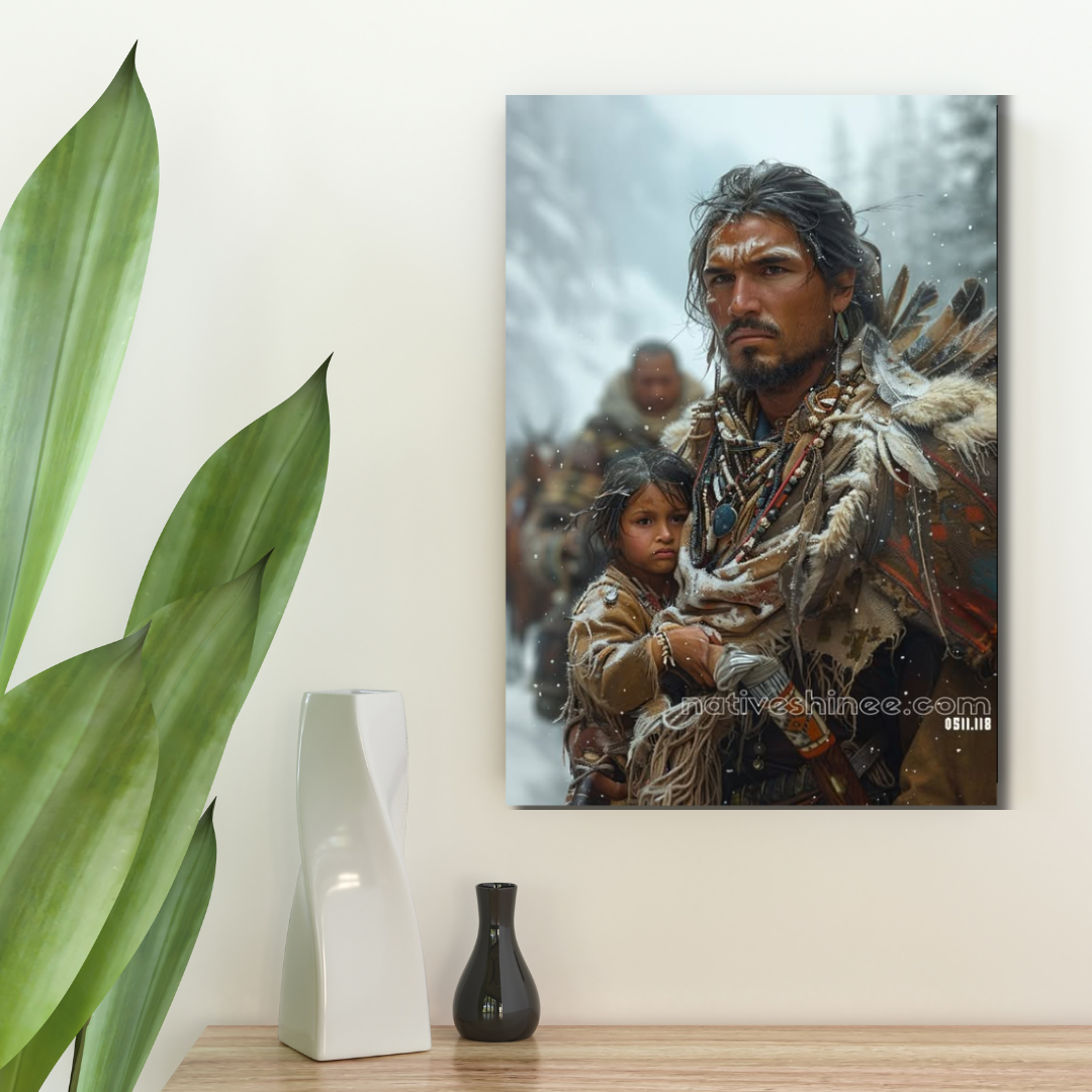 A powerful image of a determined Native American father holding his child close, their gazes brimming with resilience and hope amidst the unforgiving winter landscape. The intricate beadwork and feathers on his attire echo the deep cultural heritage, while the child’s wide eyes speak of innocence and trust. With others journeying in the background, this poignant scene captures the strength and unity of a people safeguarding their legacy against all odds. This is Guardians of the Future: A Native American Canvas