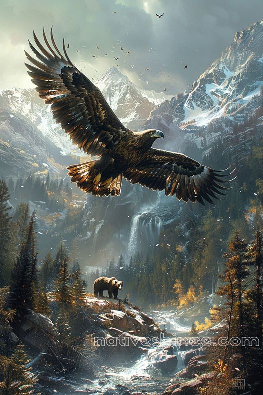 This awe-inspiring canvas captures the majesty of two sacred animals, the eagle soaring high above the valley and the bear standing tall among the rugged terrain. Set against the backdrop of towering snow-capped mountains and cascading waterfalls, the scene embodies the raw power and beauty of nature. Both the eagle and the bear are revered in Native American culture, symbolizing strength, wisdom, and guardianship. The untamed wilderness reflects the deep connection between the animals, the land, and the people who honor these sacred spirits.