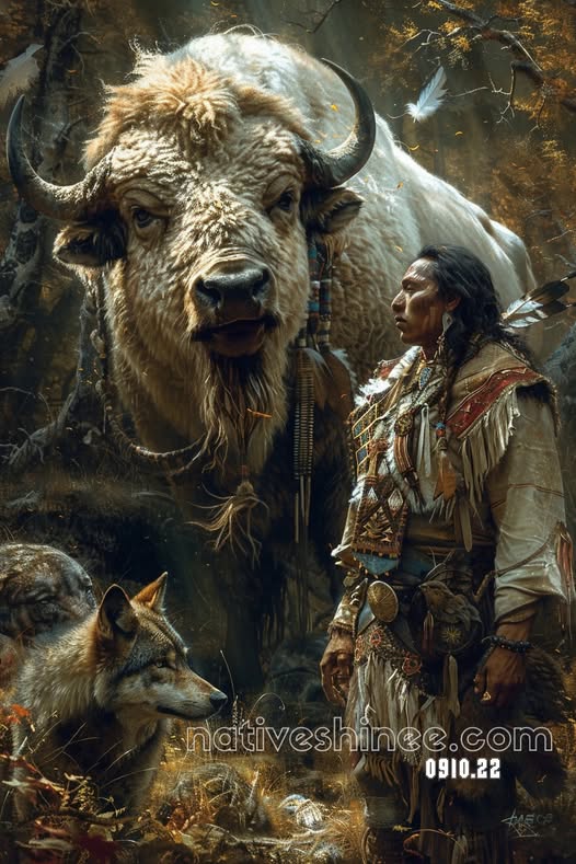 "Guardians of the Spirit Realm" is a powerful canvas artwork that portrays a deep spiritual connection between man, nature, and the sacred animals of the land. The scene features a Native warrior standing in reverence beside a mighty white bison, a symbol of hope, unity, and sacred prophecy. A watchful wolf stands by his side, representing loyalty, instinct, and protection. Set within a richly textured forest, the composition is filled with earthy tones, feathers, and the soft glow of spiritual light, emphasizing a harmonious balance between human and nature. The detailed regalia worn by the figure pays homage to Indigenous traditions, while the animals symbolize strength, guidance, and the ancestral spirit. This captivating artwork evokes a sense of timeless wisdom and inner power, making it a meaningful addition to any home, office, or sacred space.