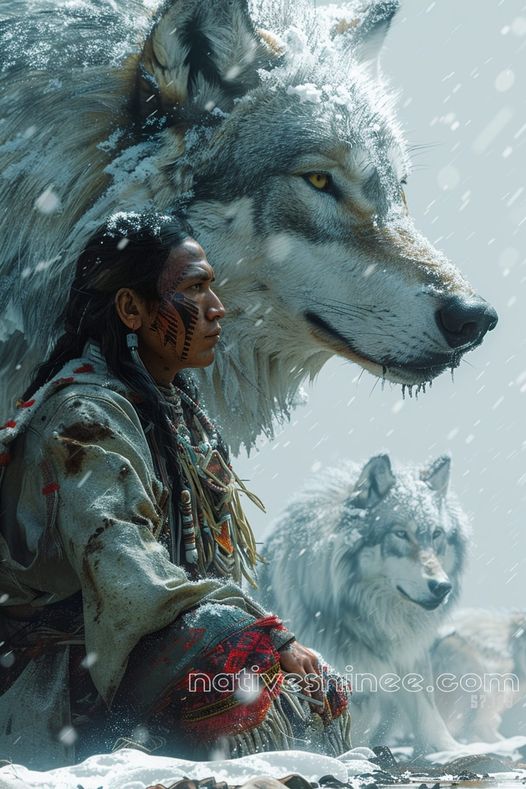 In the heart of a winter storm, a young Native American warrior sits calmly in the snow, surrounded by two majestic wolves. Their powerful presence stands as both guardians and spiritual guides. The largest wolf, towering above the warrior, watches the horizon with a piercing gaze, embodying strength and wisdom. The snowflakes swirl around them, highlighting the bond they share with nature and each other. The warrior, with his face adorned in traditional markings, embodies serenity and purpose, as if in quiet reflection or preparing for a journey ahead. This image captures the deep connection between human and the wild, symbolizing loyalty, protection, and the unspoken understanding of kindred spirits in the vast wilderness.