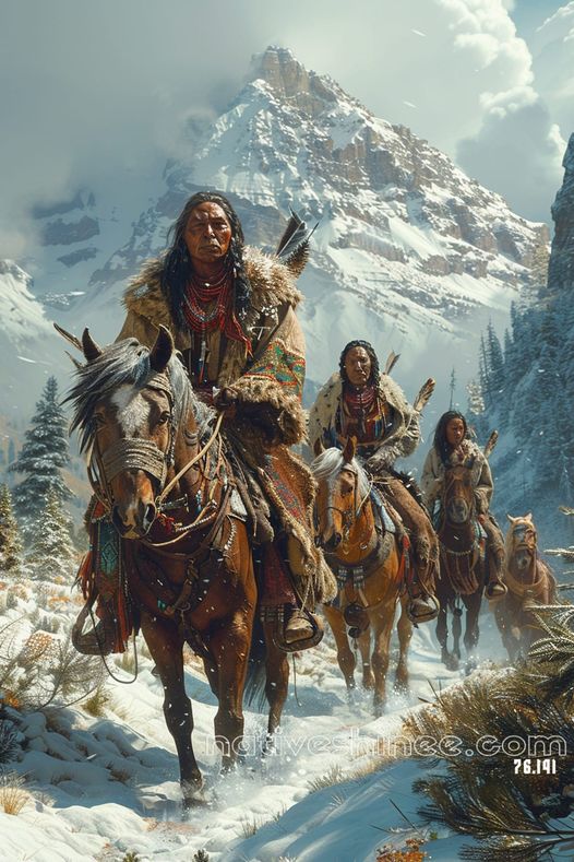This striking canvas captures a group of Native American riders journeying through a snow-covered mountain pass. Wrapped in traditional attire to brave the cold, the leader’s steady gaze reflects resilience and wisdom, embodying the spirit of guardianship over their people and land. The majestic peaks loom in the background, emphasizing both the beauty and challenge of their environment. Each rider is portrayed with incredible detail, from the intricate beadwork to the natural furs, grounding them in heritage and strength. This artwork is a powerful portrayal of endurance, unity, and reverence for nature, offering viewers a window into the enduring legacy of Indigenous life and resilience.