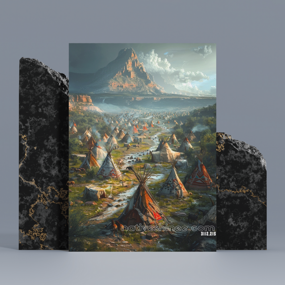 This breathtaking canvas presents a stunning panoramic view of a Native American village nestled in the valley beneath a towering mountain. The scene is alive with the bustle of daily life, as smoke curls up from multiple teepees scattered across the landscape. The mountain’s towering presence represents both strength and resilience, standing as a steadfast guardian over the people who call this land home. Horses graze by the water, and various figures can be seen walking through the village or tending to their animals, embodying the harmony between the Native American people and the natural world. The colors of the teepees, adorned with traditional patterns, add vibrancy to the earthy tones of the wilderness, while the warm light of the setting sun illuminates the entire scene, casting a golden glow on the village and its inhabitants. This is not just a village; it is a powerful testament to the legacy of Native American culture and their deep connection to the land.