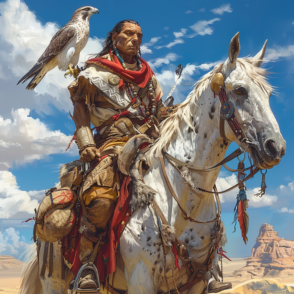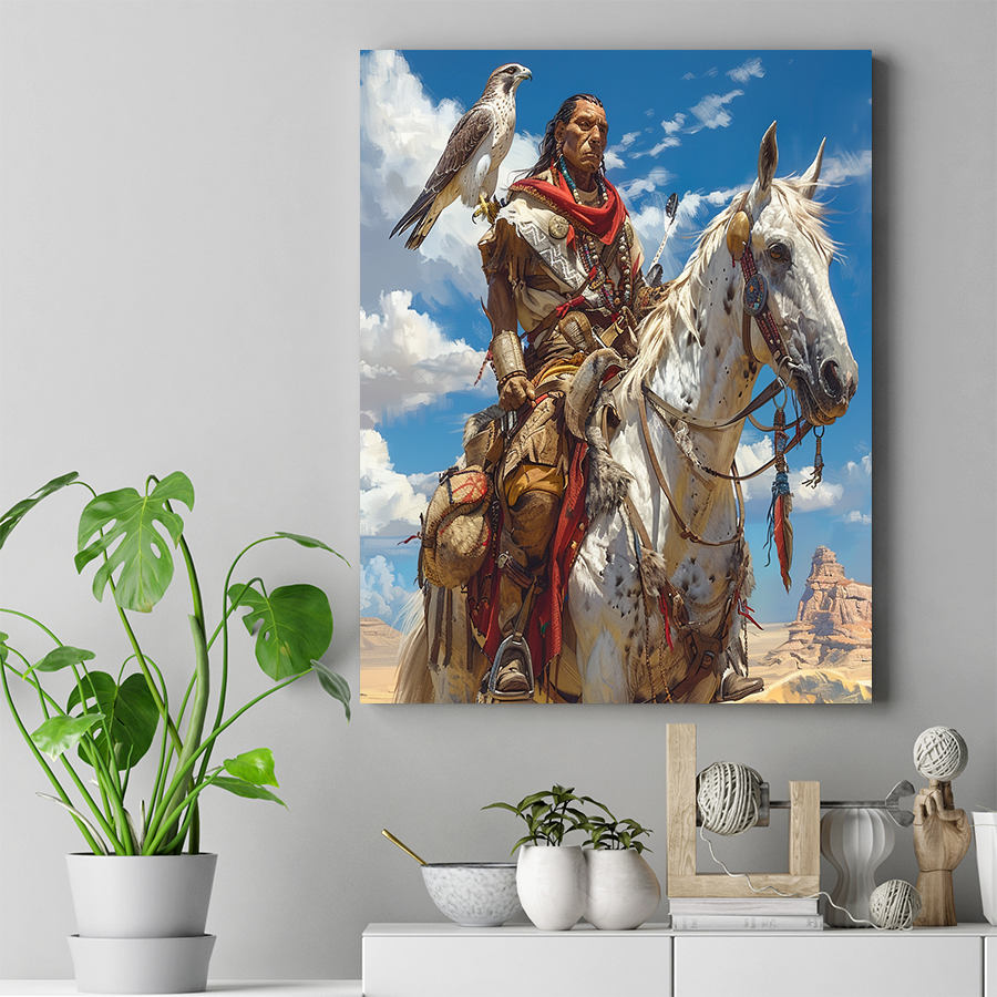 The "Harmony of Spirit: The Warrior and the White Horse Native American Canvas" encapsulates the profound connection between a Native American warrior and his majestic white horse. This stunning artwork portrays the duo in a serene, natural setting, symbolizing strength, freedom, and the deep spiritual bond shared between man and beast. The intricate details and vibrant colors evoke a sense of reverence for nature and tradition, capturing the essence of Indigenous culture. Perfect for those who appreciate themes of unity and resilience, this canvas serves as a striking focal point that honors the enduring spirit of the warrior and the land they cherish.