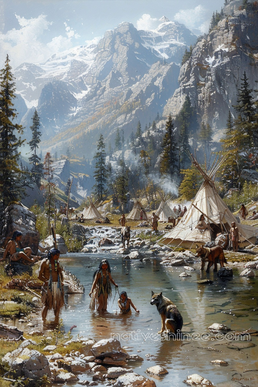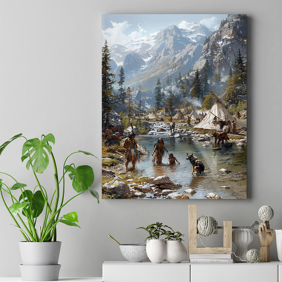 The "Harmony with Nature in Tribal Lands Native American Canvas" beautifully depicts the peaceful coexistence between Indigenous communities and the natural world. This artwork features lush landscapes and elements of tribal life, capturing a deep connection to sacred lands and traditional ways of living. A tribute to Native respect for the environment, this canvas enriches any space with its calm presence and reverent portrayal of ancestral lands, offering a glimpse into a life lived in balance with nature.