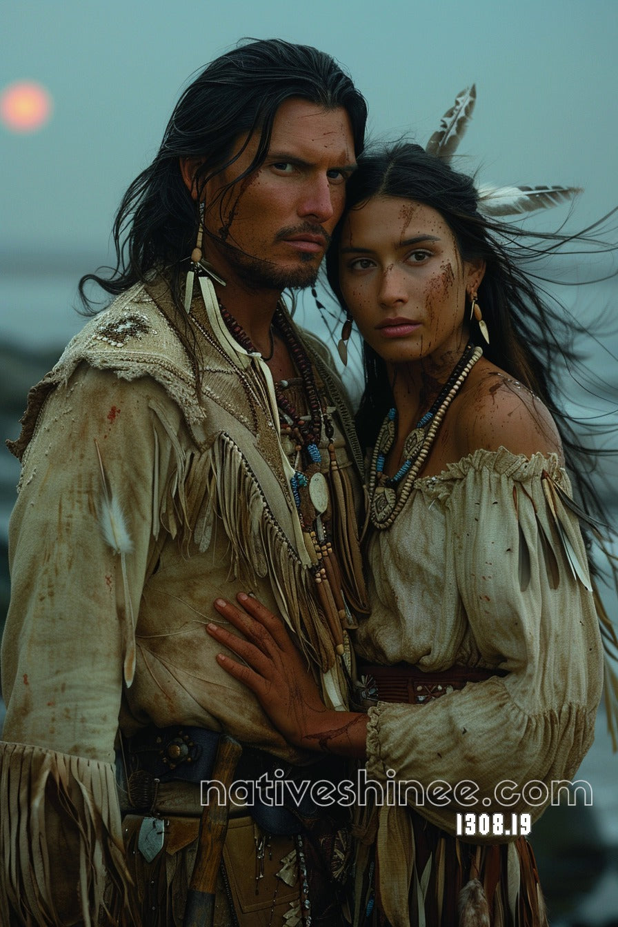 This canvas artwork depicts a Native American couple standing together as the sun sets, casting a golden glow over their traditional outfits. The man, with feathers in his hair, and the woman, adorned with beaded necklaces, share a tender embrace that symbolizes unity and strength. The background features a gradient sky transitioning from warm oranges to cool blues, adding depth and a sense of peace to the scene. Positioned above a rustic wooden cabinet with a potted plant and books, the piece brings a harmonious blend of nature and culture into the interior. The intricate details of their clothing and the subtle wind-blown hair contribute to the artwork’s lifelike quality.