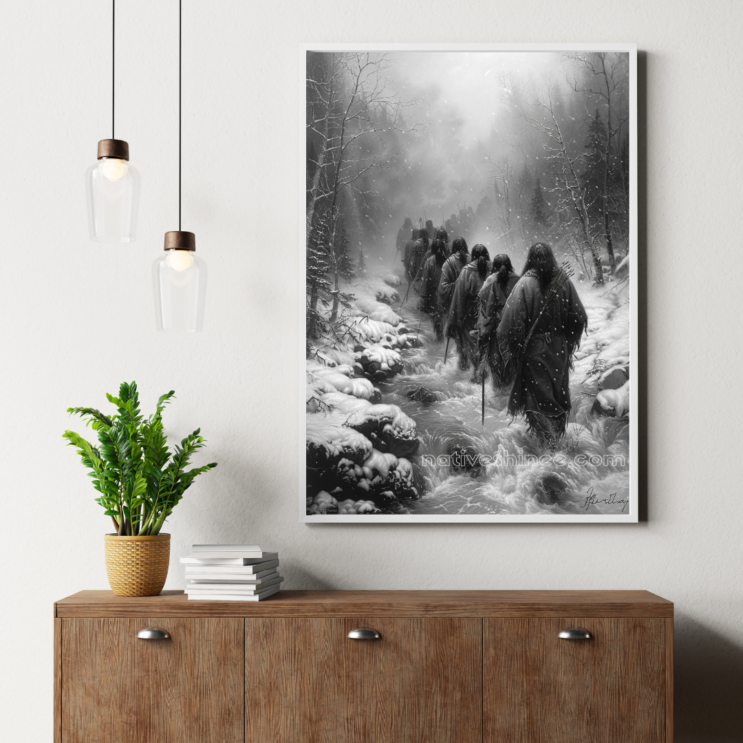 This powerful and evocative artwork captures a group of Native American individuals, solemnly making their way through a snow-covered forest. The figures, wrapped in heavy cloaks, wade through a rushing stream, their faces solemn yet determined. The winter landscape around them is shrouded in mist, with snow gently falling, adding to the atmosphere of quiet endurance. The group, with arrows slung across their backs, symbolizes both survival and resilience as they journey through this challenging environment. The scene speaks to their deep connection to the land, nature, and their people, embodying strength, unity, and unwavering spirit in the face of adversity.