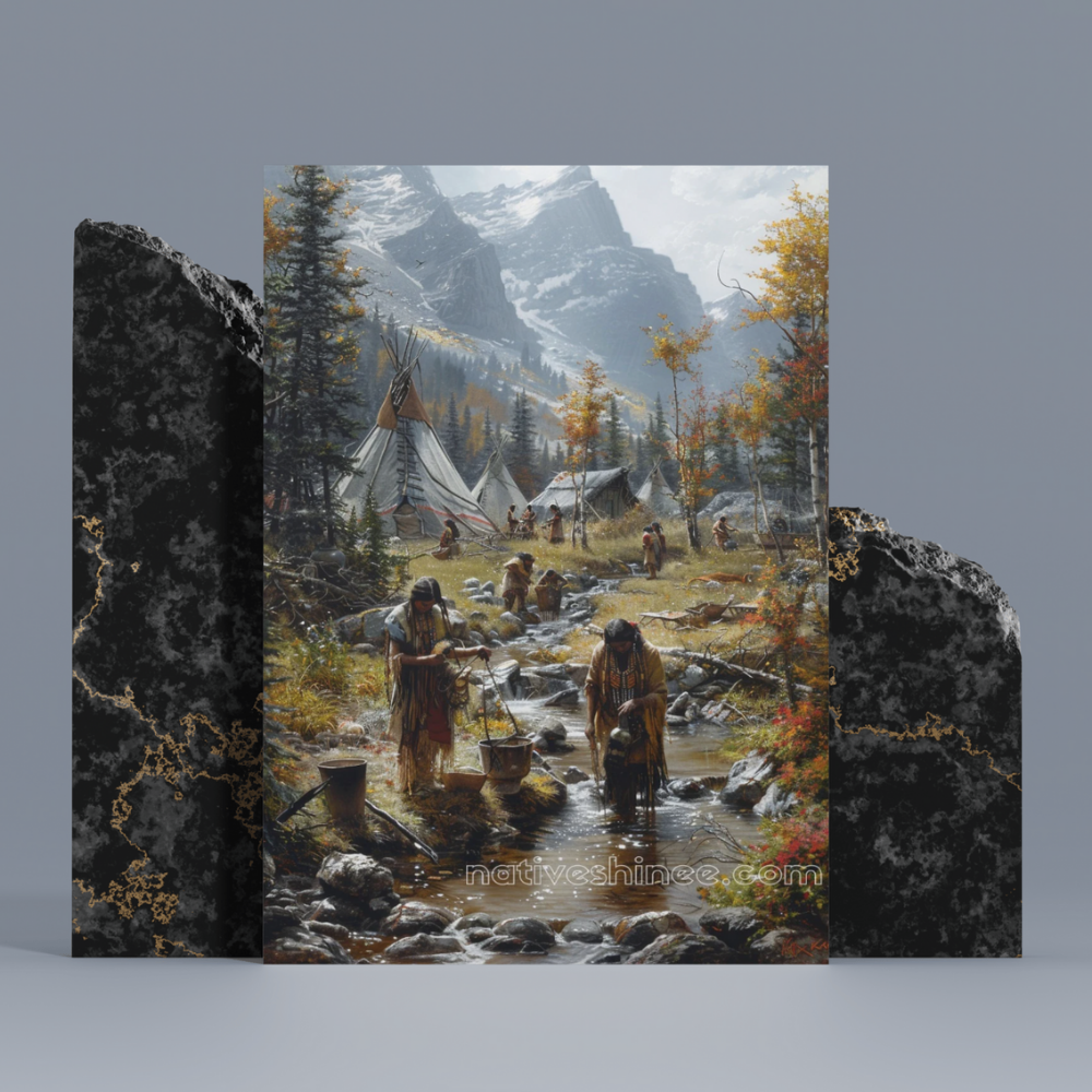 This beautiful image showcases a bustling Native American village nestled in a stunning mountain valley, where a group of people are engaged in the daily tasks of survival. In the foreground, individuals can be seen gathering water from a nearby stream, their clothing and beadwork reflecting the intricacies of their cultural heritage. The vibrant colors of the changing autumn leaves add a rich contrast to the tranquil setting, where towering peaks loom in the distance, covered with a light dusting of snow. The tipis are carefully arranged in the background, symbolizing the strong community that thrives in harmony with nature. The peaceful activity is a testament to the endurance, resourcefulness, and timeless traditions of this community.