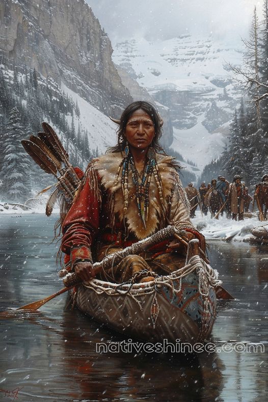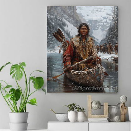 This breathtaking canvas depicts a stoic Native American warrior navigating through a snow-covered landscape, paddling a beautifully crafted canoe along a frozen river. Surrounded by towering mountains and the chilling embrace of winter, the warrior is the embodiment of resilience and leadership, guiding his people who walk solemnly along the river's edge. Their rich traditional garments, adorned with beads and fur, highlight the deep connection to their culture and heritage. This artwork masterfully captures the endurance of the Native American spirit in the face of nature’s harsh elements, telling a story of survival, community, and harmony with the land. A powerful piece for those who appreciate both the beauty of nature and the strength of human determination.