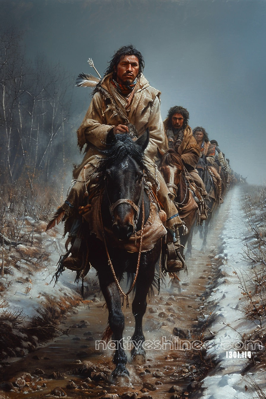 The Journey of the Native Riders Native American Canvas captures the strength and resilience of Native American riders traveling through a snow-covered path. This stunning artwork portrays the unity and perseverance of these warriors, depicted with intricate detail in their traditional attire and powerful horses. The cold, rugged environment enhances the deep connection to nature, highlighting the enduring spirit of Native American culture. Perfect for those who appreciate history and art, this canvas makes an inspiring addition to any home or office, evoking a sense of respect for their heritage and way of life.