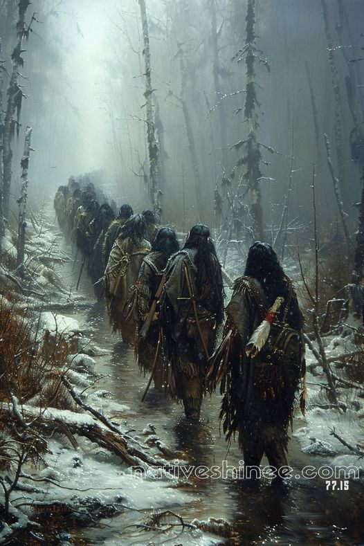 In the heart of a frozen forest, a line of Native American figures moves solemnly through the mist, their forms blurred by the icy air and snow-laden branches. Clad in traditional attire, they carry the weight of their past and the uncertainty of their future as they march in silence, unified by purpose. The cold earth beneath their feet reflects the harshness of their path, while their resilience and connection to the land endure. This haunting yet beautiful scene captures the struggle and strength of a people deeply connected to their journey, a tribute to the enduring spirit of survival and unity.