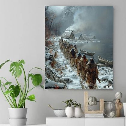 This evocative artwork portrays a solemn procession of Native American figures walking alongside a snow-laden riverbank. Wrapped in traditional garments, they move with quiet determination, the smoke of nearby lodges rising in the cold winter air. Wooden canoes rest by the river, symbolizing a connection to water and the promise of movement to new horizons. The muted tones of the snowy landscape highlight the resilience and unity of the people, capturing a moment of endurance and collective strength. A timeless tribute to the spirit of perseverance and the bonds of community.
