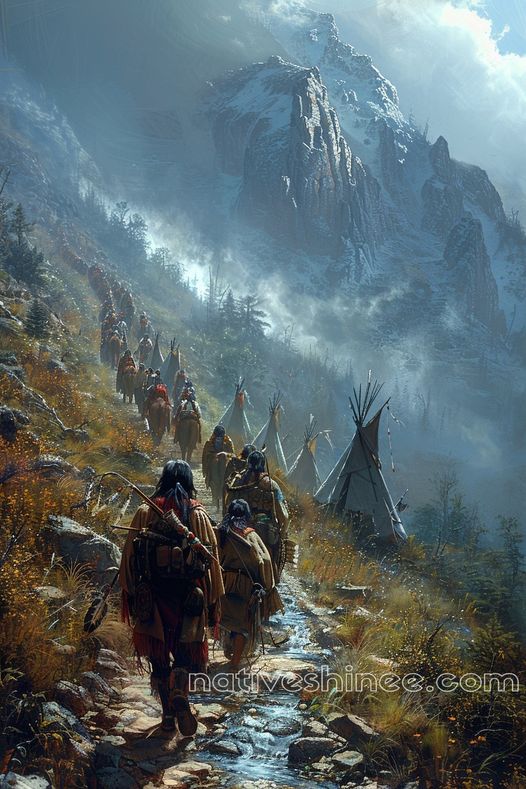 A group of Native American warriors and families trek through a rugged mountain pass, their path winding through steep and misty terrain. The towering peaks loom above them, partially hidden by clouds, while a few teepees stand scattered in the valley below. The air feels cold and crisp, with the sunlight just beginning to break through the clouds, illuminating their determined journey. Dressed in traditional garments, the group’s spirit reflects strength and resilience, deeply connected to the land they travel. This canvas captures the majestic beauty of nature and the enduring perseverance of Native American culture.